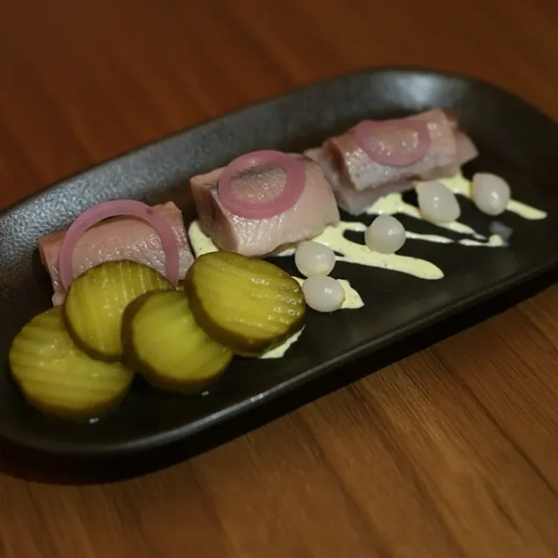 Śledź jest czyszczony i peklowany w soli, podawany z majonezem z rukwi wodnej, cebulą perłową i holenderskimi piklami.