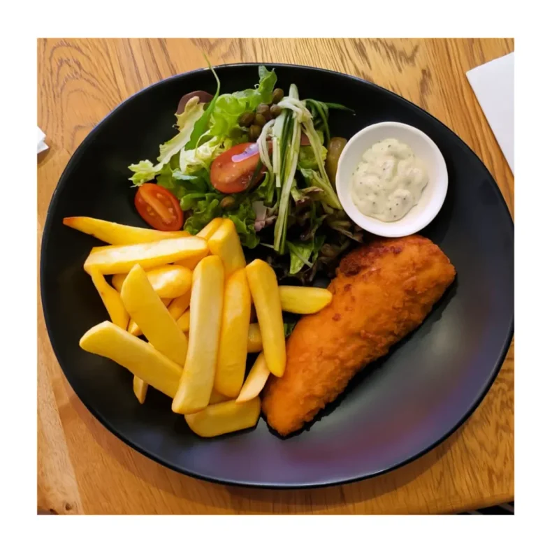 Smażony filet z morszczuka panierowany w bułce tartej, z sałatką, frytkami i sosem Remoulade, będącym aromatyczną mieszanką majonezu, musztardy, pikli i ziół